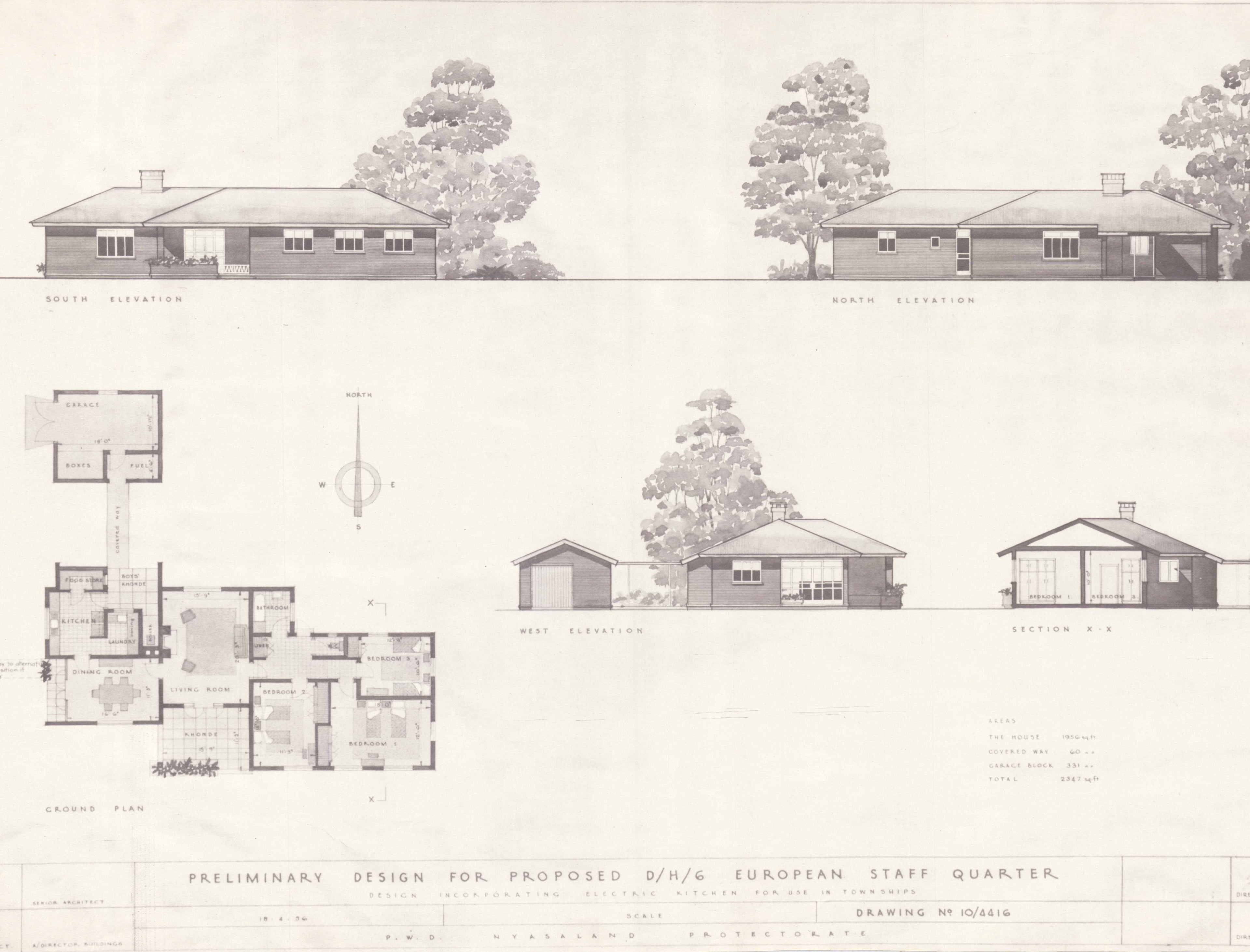 Preliminary designs, Housing, DH/6 European Staff Quarters, Public Works Department, Zomba, Nyasaland Protectorate, April, 1956.. Courtesy of Scarr family