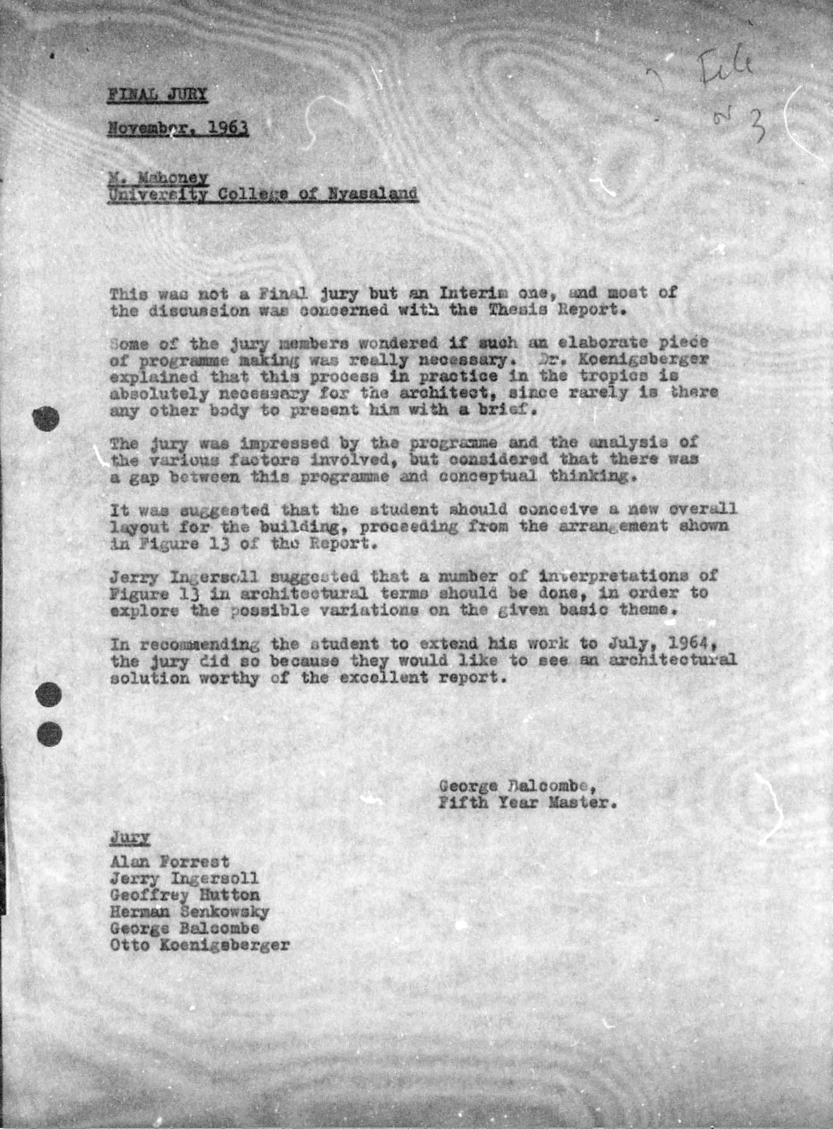 Interim Thesis Criticism, Carl Mahoney, 'University, Nyasaland', 12th March, 1963. AA Archives