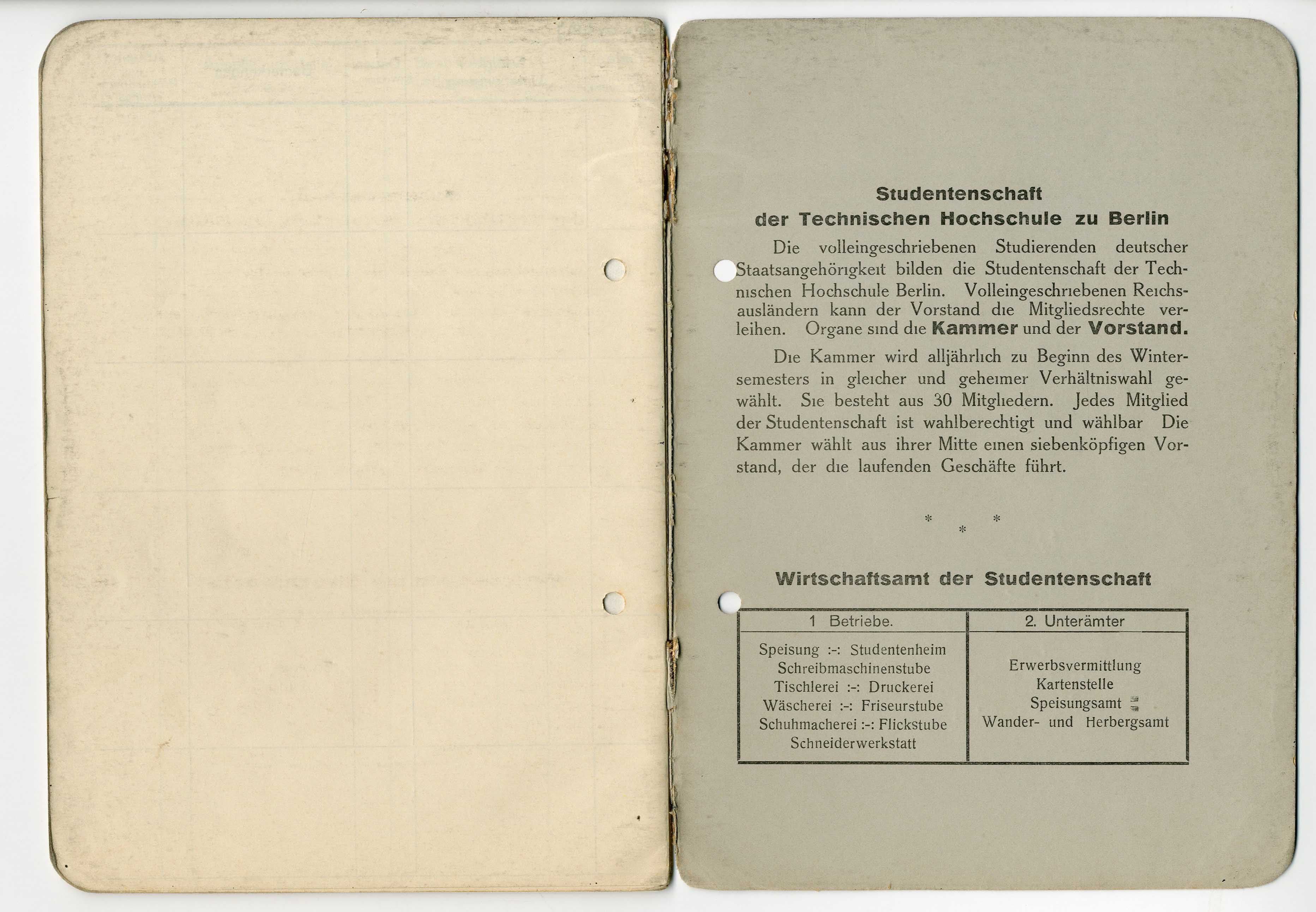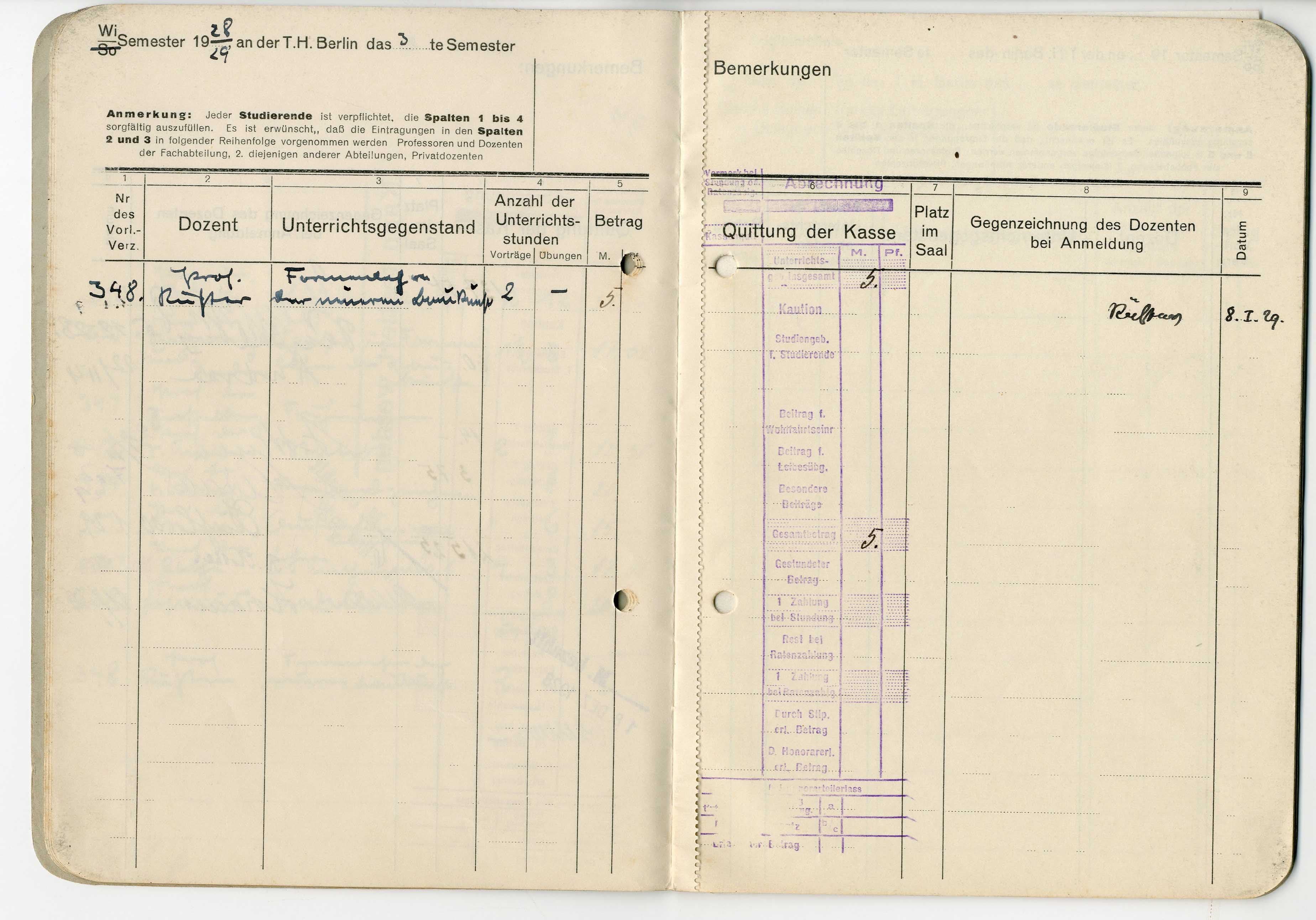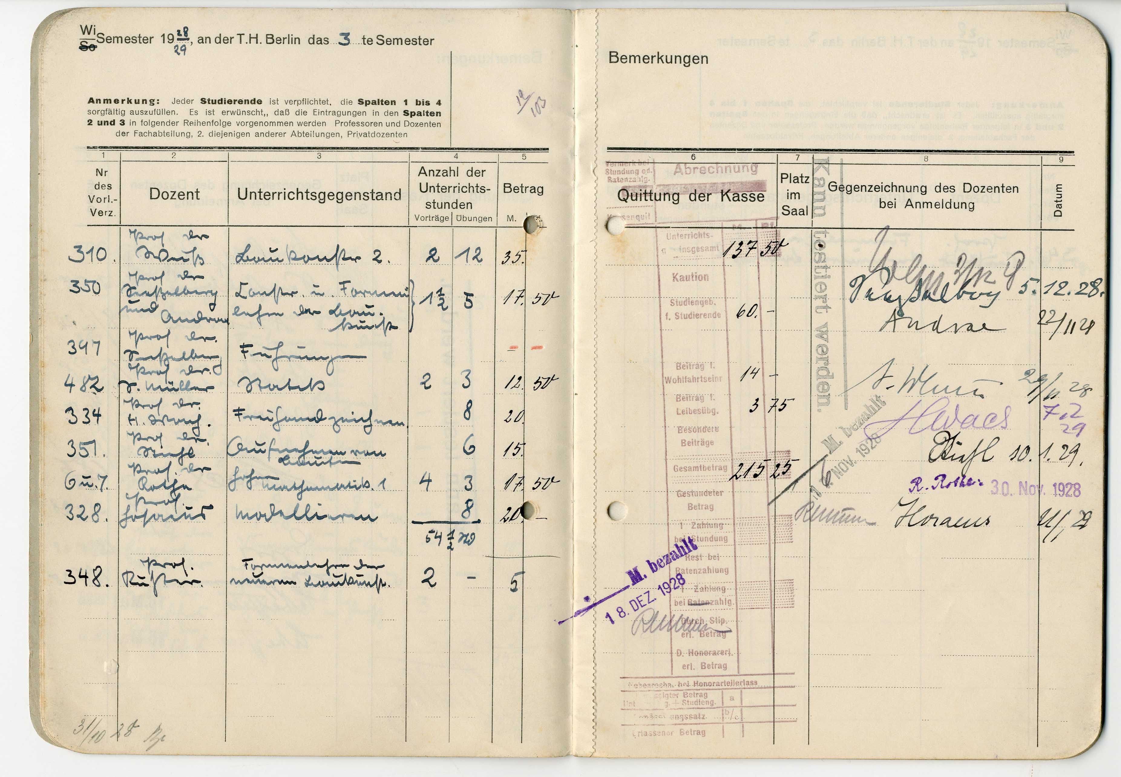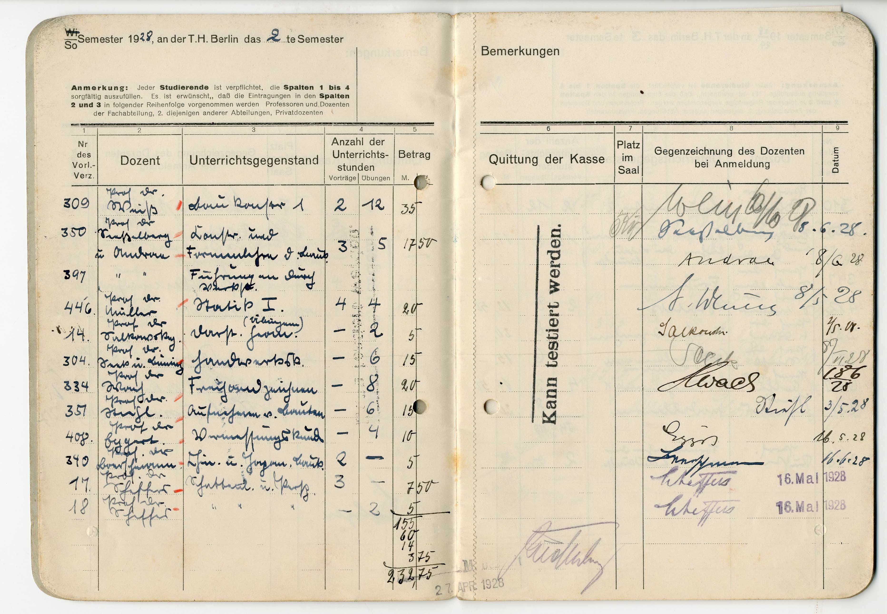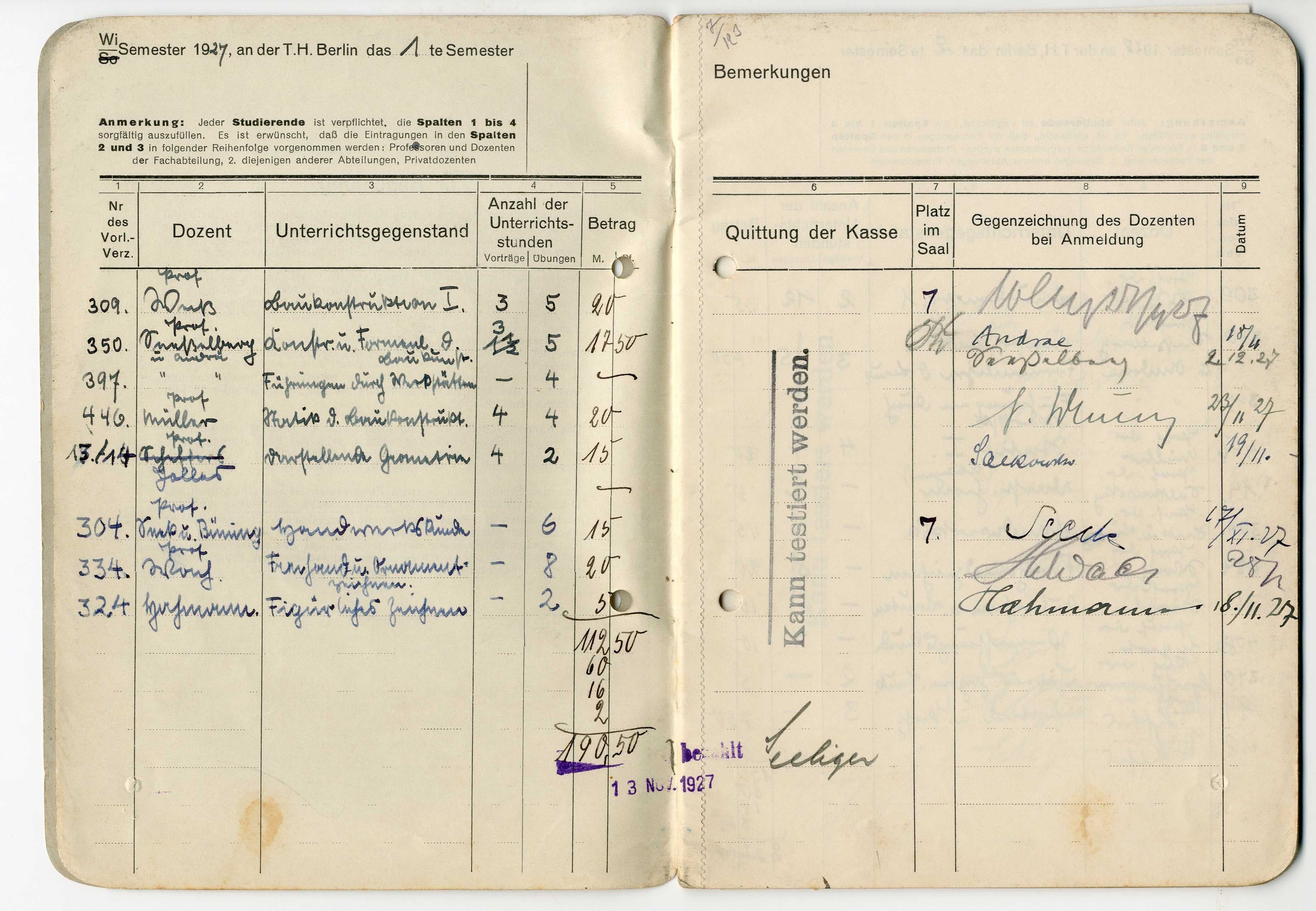 Otto Koenigsberger's 'belegbuch' (record of attendance and marks) for his studies at the Technische Hochschule, Berlin, 1927-1929.