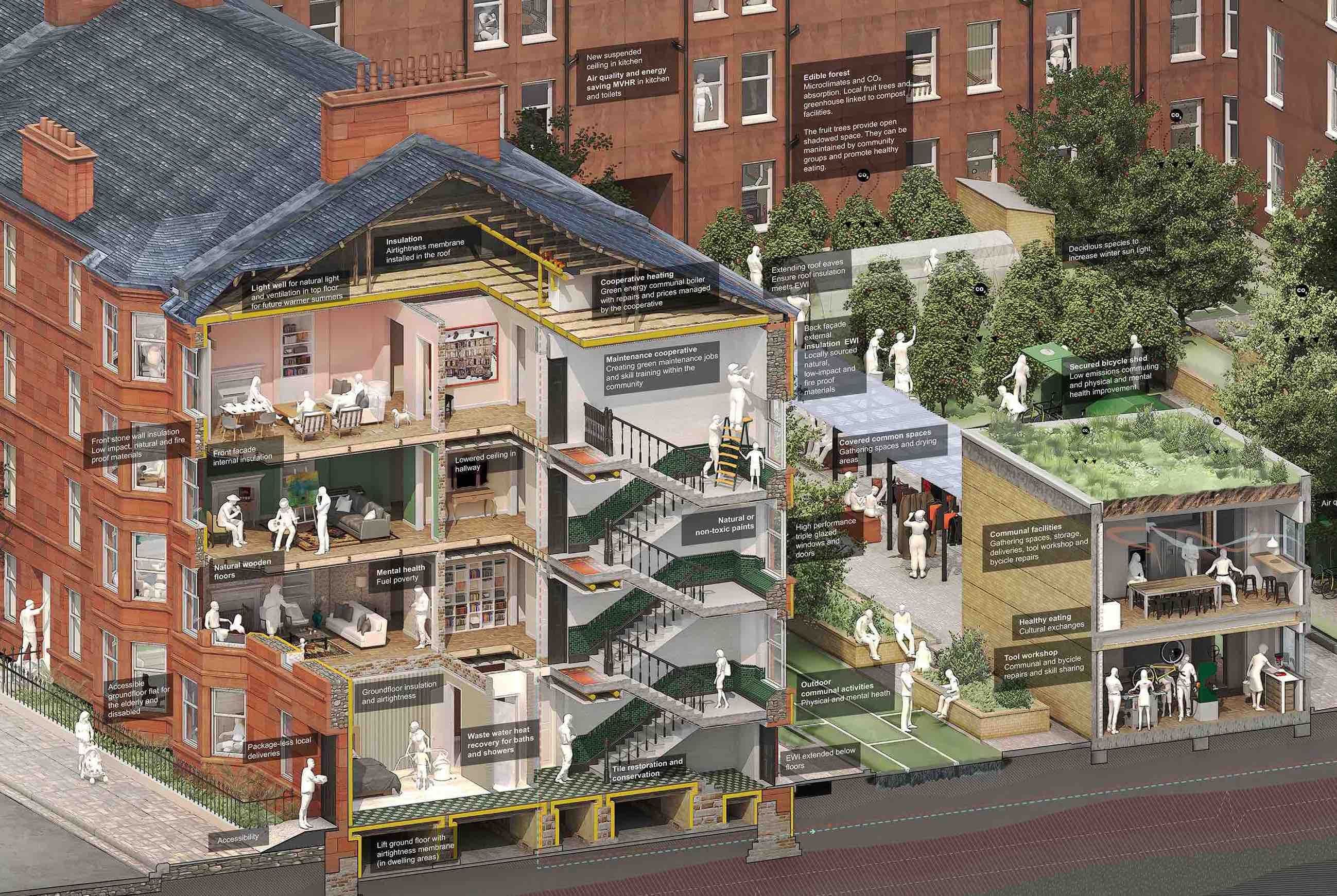 Image: Glasgow’s iconic tenement buildings are a central pillar of the city’s landscape. A retrofitting revolution to create net-zero, decent homes for all is an opportunity to create good local jobs in rooted supply chains, tackle fuel poverty, and create shared spaces for communities to use. Image by AA Groundlab