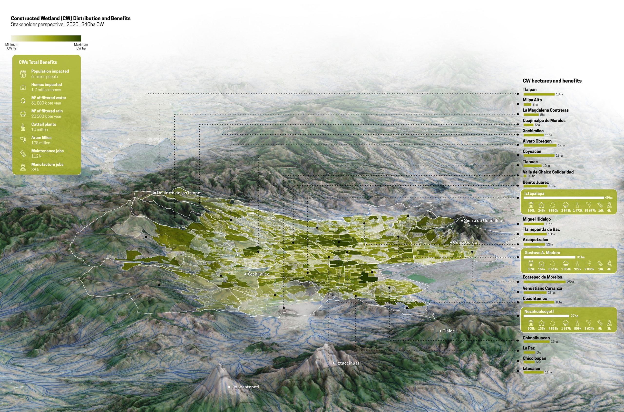 Image: A tool that depicts future scenarios of Mexico City from 2020–2050. The tool has been created by the AA Groundlab and the Centre for Advance Spatial Analysis, the British Geological Survey and the Socio Hydrological Resilience Tool, 2021.