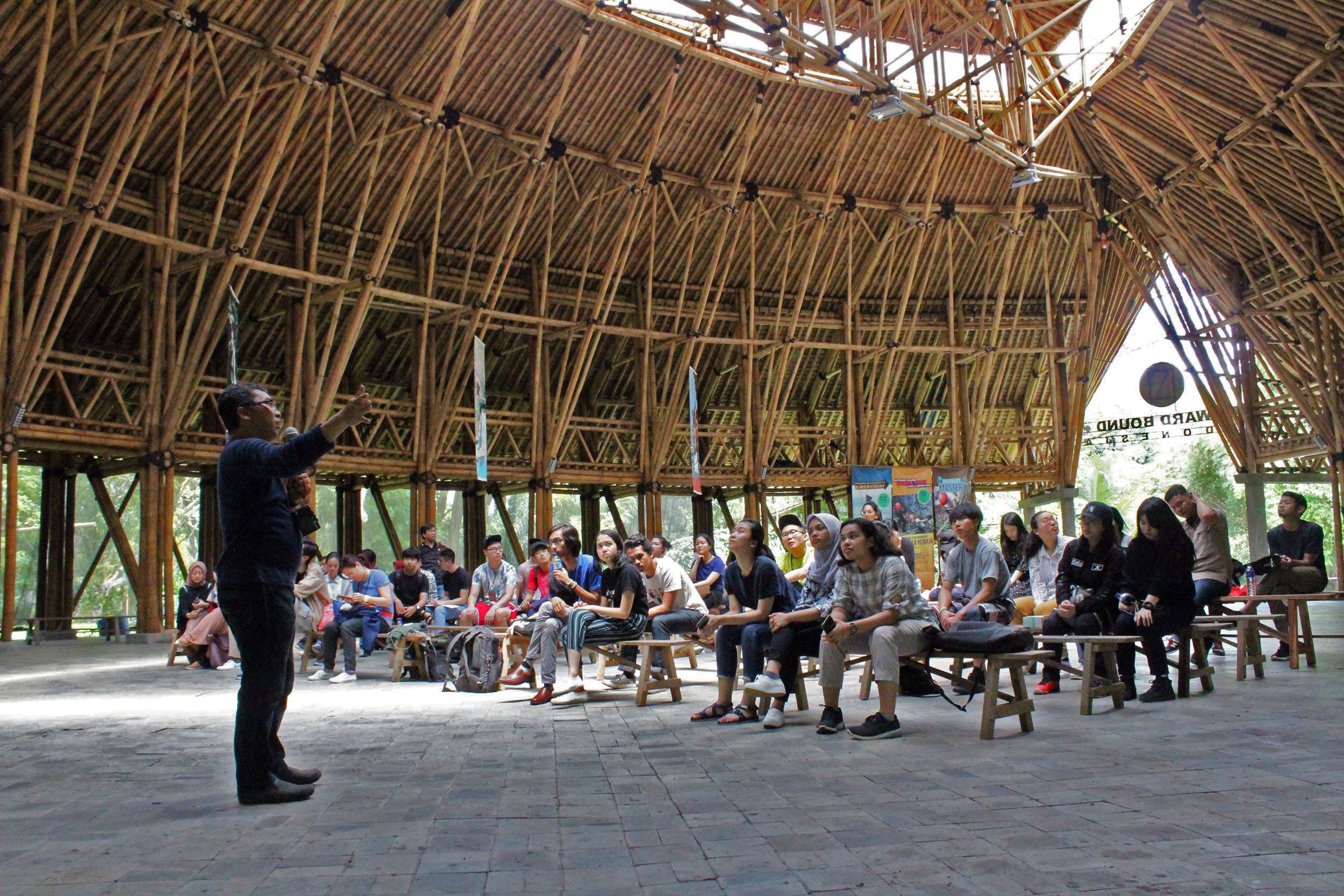 Image: Course co-head Dr Andry Widyowijatnoko discussing his design for the Great Hall OBI, outside Bandung in Indonesia, with students on the 2018 AA-ITB BambooLab course. Photography courtesy of AA Visiting School.