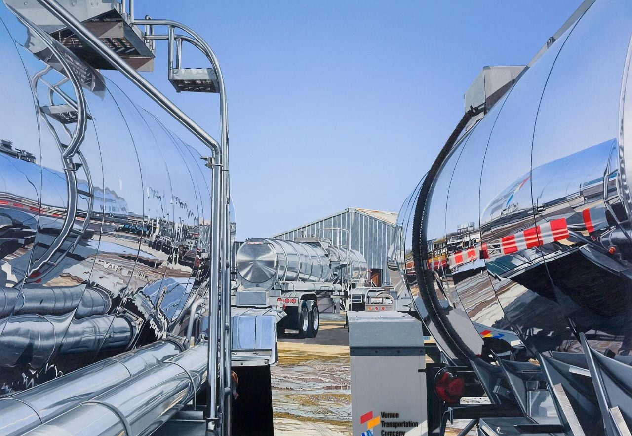For 50 years, Andrew Holmes has pursued the trucks, trailers, tanks and highways of the American West in a series of 100 large scale drawings. The subject is the Interstate Highway system, which is the largest structure in the world measuring at 43,000 miles, and was conceived and designed as a single entity. This is the mobile armature that sustains the artificial oasis of Los Angeles, or rather the lines of transportation that maintain the city across the harsh surrounding desert. The work documents, analyses, and classifies the machines driven by the men and women who ride and maintain this armature. It offers glimpses of the fetishes of blue collar America, the classical Kenworth truck, the baroque curve of the stainless container, and the pearlised gleam of the custom car. The lovingly embellished mass-produced objects become stand-ins for their owners.