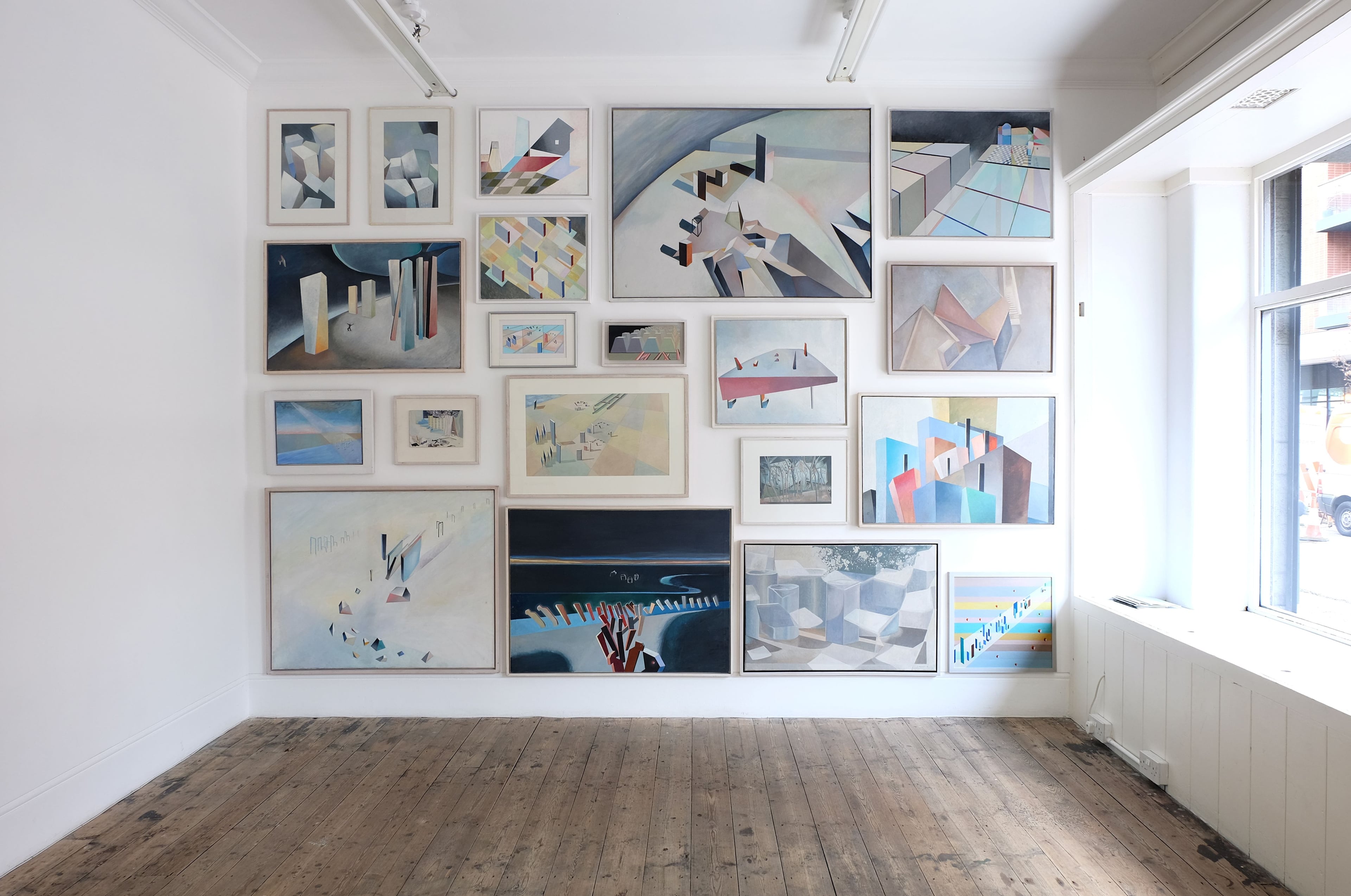 "Crowded on to one wall, academy-style, is a lifetime of work, a line passing through towers and tombs, trees and cubist landscapes, but the thread that ties them all together is architecture, a certain type of tectonic representation. Pastel superblocks collide with deep shadows cast by looming wedges, towers appear as subsiding gravestones, buildings are scattered like disruptive pebbles on a sandy beach and walls are draped like curtains. The types of architecture contribute to a mood: melancholy, angst, playfulness, ecstasy and ennui through form, colour and distribution.
