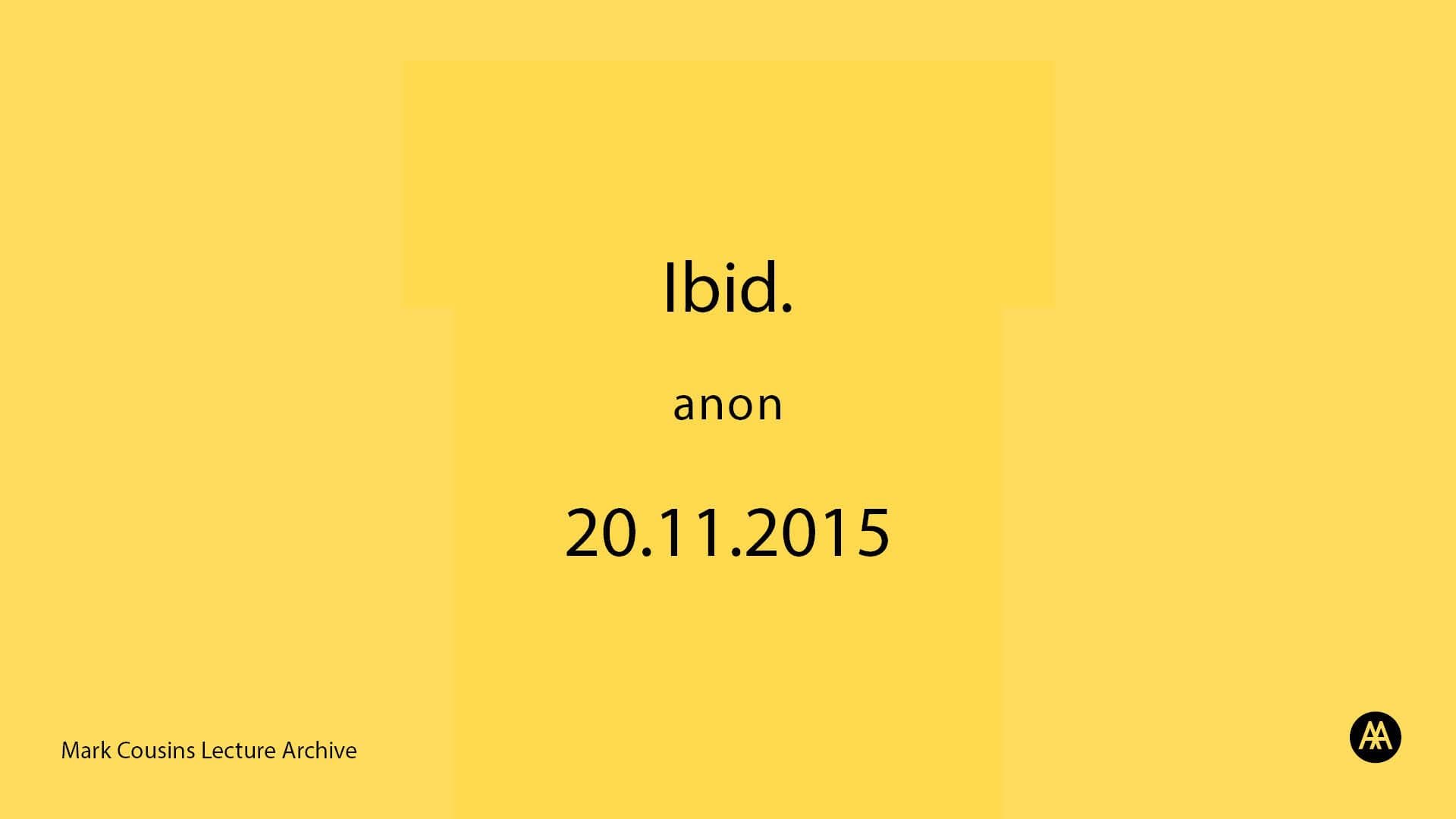 Comprises audiovisual recording of a lecture entitled 'Ibid.' given by Mark Cousins on the 20th November, 2015. The recordings consist of a digital preservation file (3.32 GB, .mpg format) and a digital access file (2.68 GB .mp4 format).