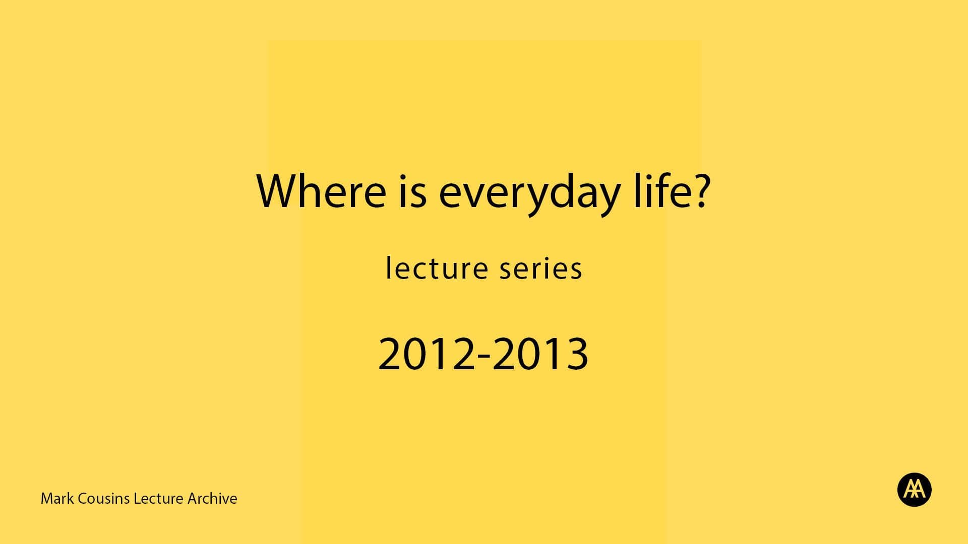 Admin History: The recording is of the 11th lecture in the series entitled 'Where is Everyday Life?', given by Mark Cousins as part of the AA Open Lecture series, 2012-2013. For the final lecture of this series, Mark Cousins borrows Walter Benjamin's concept of 'Love at last sight' to describe the manner in which he understands the 'subject' as related to the 'object' in everyday life. Cousins goes on to clarify the' object's' affinity to the 'art object', before presenting his final, concluding thoughts in the context of his readings of Giorgio Agamben.