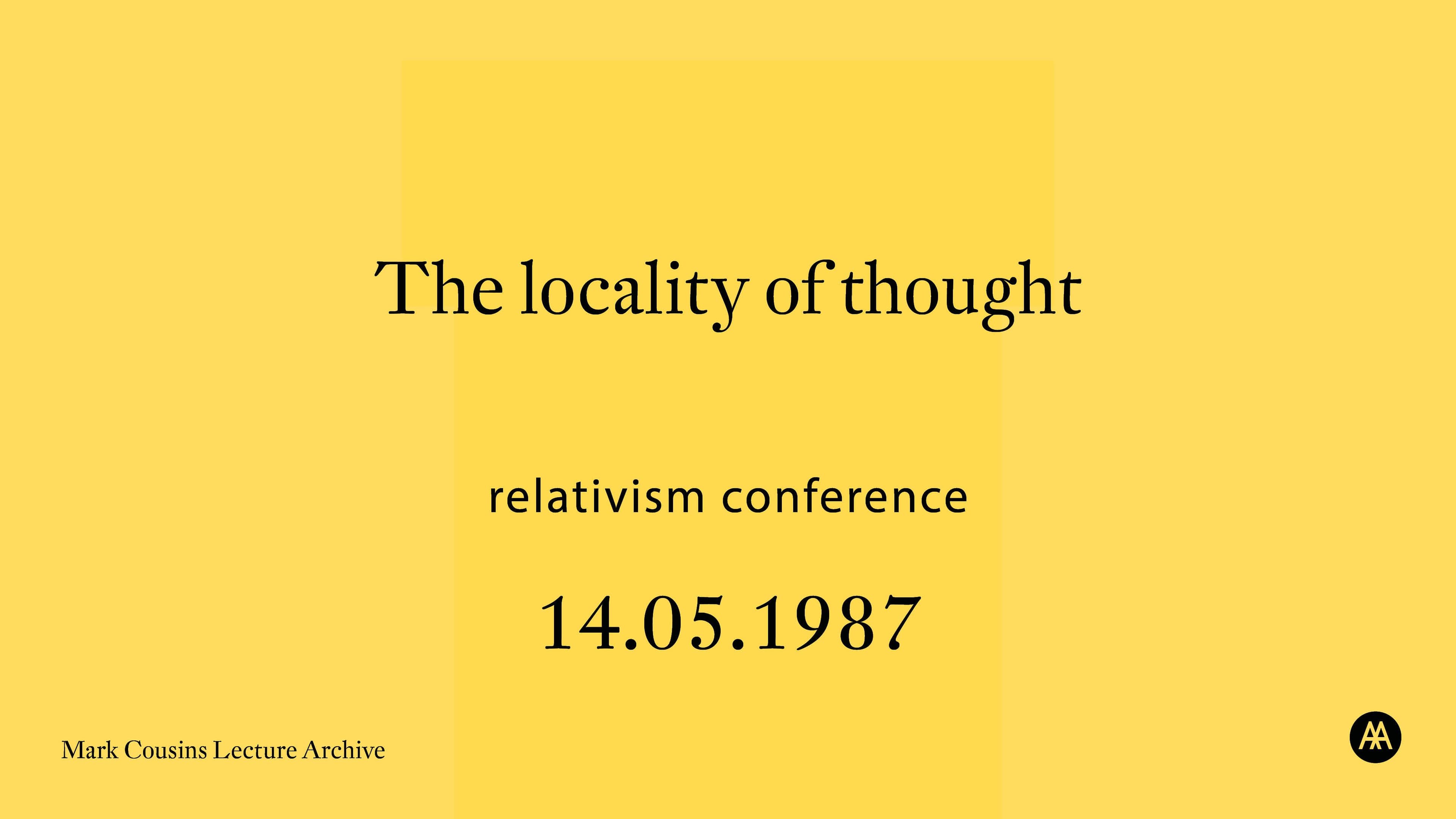 Comprises video recording of a lecture entitled 'The Locality of Thought'', given by Mark Cousins on the 14th May, 1987, as part of the conference 'Relativism', organised by the AA Graduate School / History and Theory Programme. The conference took place in the Main Lecture Hall, Bedford Square. The recordings consist of a digital preservation copy (2.81 GB, .MPG format) and a digital access copy (1.66 GB, .MP4 format). Duration of access version: 40min 28sec.