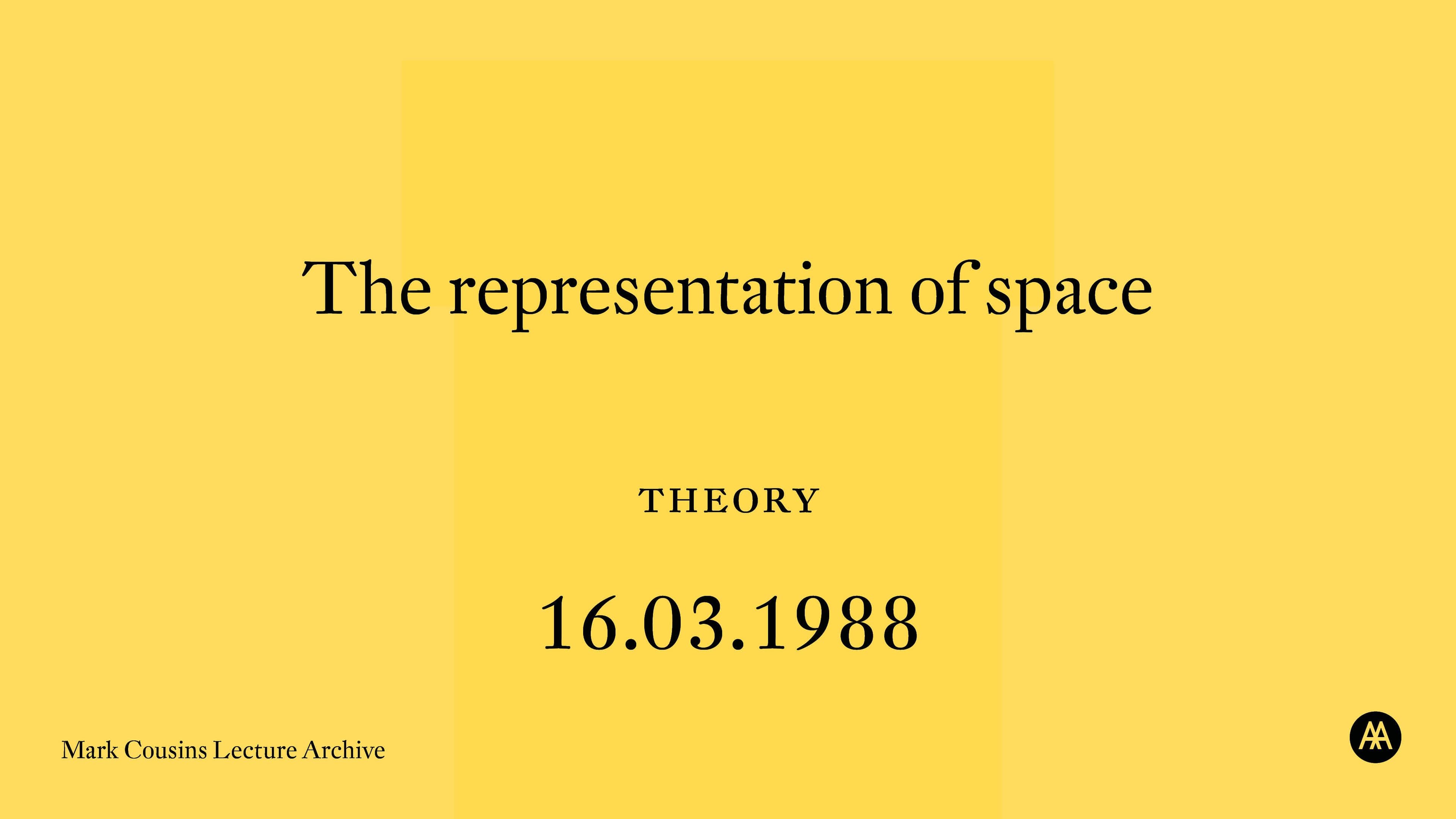 Comprises audio recording of a lecture entitled 'The Representation of Space', given by Mark Cousins on the 16th March, 1988. The lecture took place from 12 noon in the AA Graduate School Lower Seminar Room, Bedford Square. The recordings consist of a KI C90 audio cassette tape, 2 digital preservation files (859 MB, .wav format) and 2 digital access files (78 MB, .mp3 format). Duration of access version: 1h 21min 06sec.