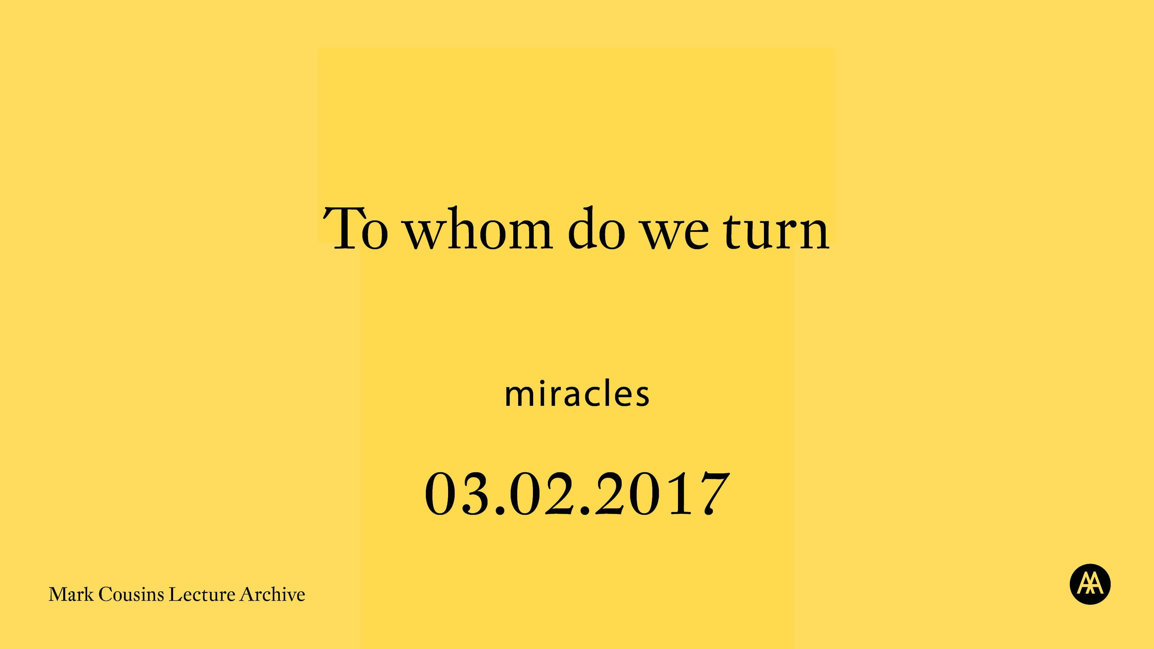 Admin History: The recording is of the 4th lecture in the series entitled 'Miracles', given by Mark Cousins as part of the AA Open Lecture series, 2016-2017. Mark Cousins continues his lecture series on 'the miracle' with an examination of the 'third-person' - the figure within the narrative framework of miracles which is commonly overlooked or forgotten. Cousins goes on to present the act of prayer as a means by which the subject endeavours to gain admission to the presence of God, the essence of the prayer being to experience the presence of God.