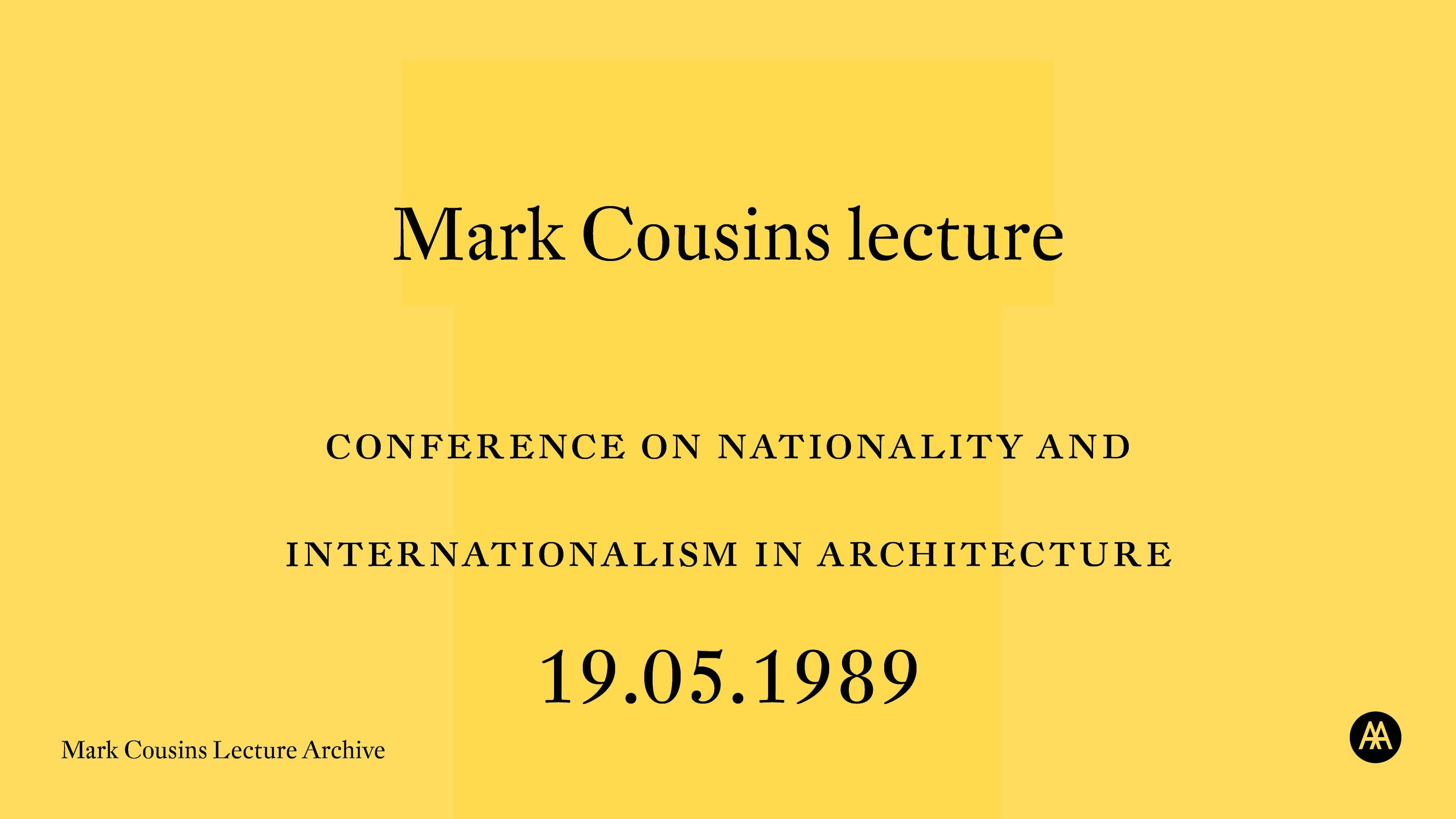 Comprises video recording of an untitled lecture given by Mark Cousins on the 18th and 19th May, 1989, as part of the conference 'Nationality and Internationality in Architecture', organised by the AA Graduate School. The conference took place from 10am in the AA Main Lecture Hall, Bedford Square. The recordings consist of a digital preservation copy (198 MB, .MPG format) and a digital access copy (100 MB, .MP4 format). Duration of access version: 20min 53sec.