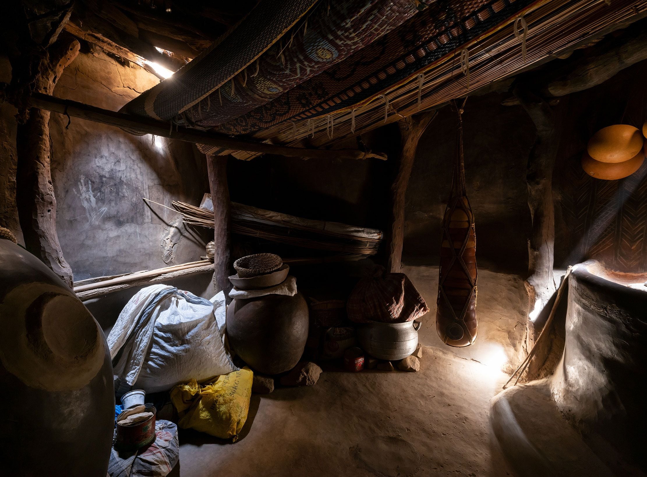 Image: A storage area in a traditional house containing an entire household's goods lit up by daylight streaming through two skylights, Tiébélé, credit: Iwan Baan, 2021.