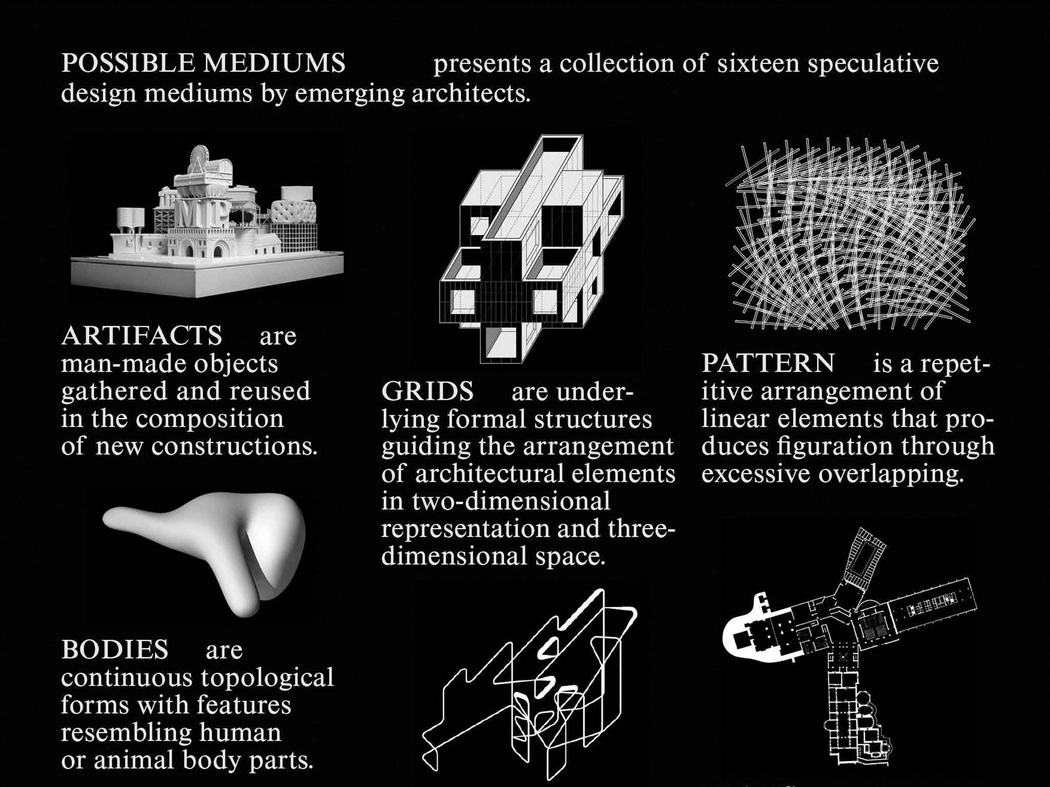 The Possible Mediums project is a series of events showcasing design investigations based in speculative architectural mediums and is organized by Kelly Bair, Kristy Balliet, Adam Fure and Kyle Miller. The Possible Mediums book presents a collection of sixteen speculative design mediums by emerging architects. Each chapter defines an active medium in contemporary architecture through descriptions, drawings, and objects. Possible Mediums arranges projects according to shared technical and aesthetic traits, creating a vibrant taxonomy of design. Descriptive texts explain the working principles behind each medium and introduce design concepts intended to inspire students and professionals alike. Through its many contributors, Possible Mediums establishes design as a collective endeavor propelled by the open exchange of ideas and techniques. Possible Mediums is not a systematic theory, a manifesto, or a banal survey; it is a projection of architecture and knowledge to come.