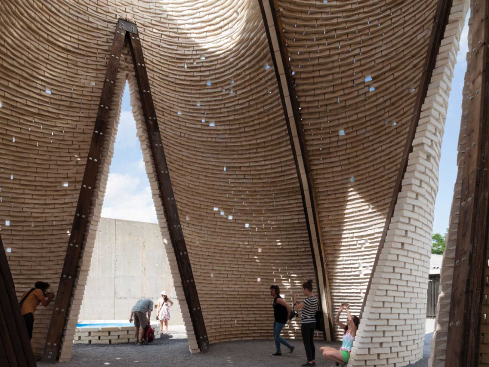 Image caption: HY-Fi in the courtyard of MoMA PS1, built from 10,000 grown bricks.