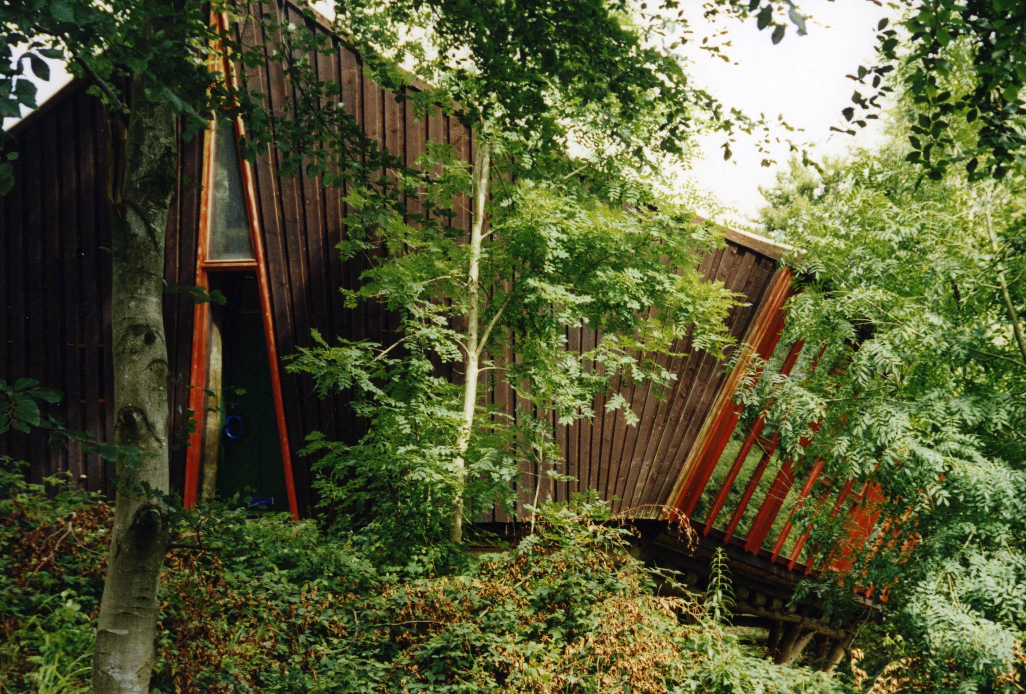 Now used as the campus Refectory, the Prototype House was completed in 1986 and was the first building to be realised at Hooke Park under the stewardship of John Makepeace and the Parnham Trust, who owned the woodland before the AA. Designed by Ahrends, Burton and Koralek (ABK), Frei Otto and Buro Happold, it was initially designed as accommodation for the School for New Woodland Industries that Makepeace established at Hooke Park in the 1980s. The building is supported by a series of four Corsican pine roundwood A-frames, holding up a ridge cable from which slim roundwood rafters made from Norway spruce thinnings are hung.