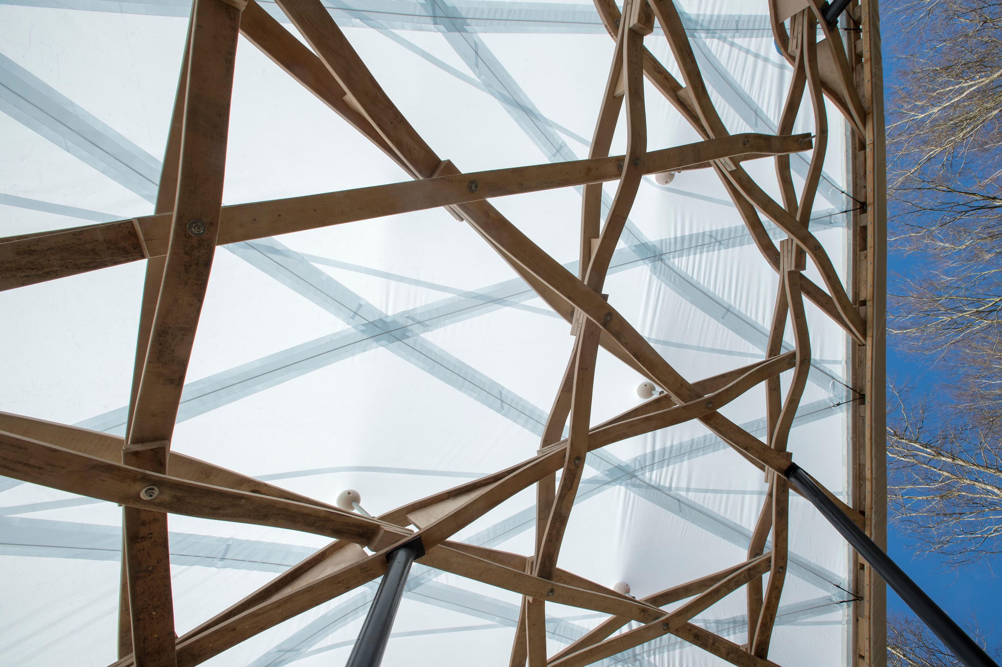 The Timber Seasoning Shelter provides a canopy for air-drying timber felled from the surrounding woodland, to use in student-designed buildings on site. Built from timber harvested from Hooke Park’s beech trees, the project was created by Design and Make students to test the innovative use of steam-bent timber elements in a reciprocal grid structure.