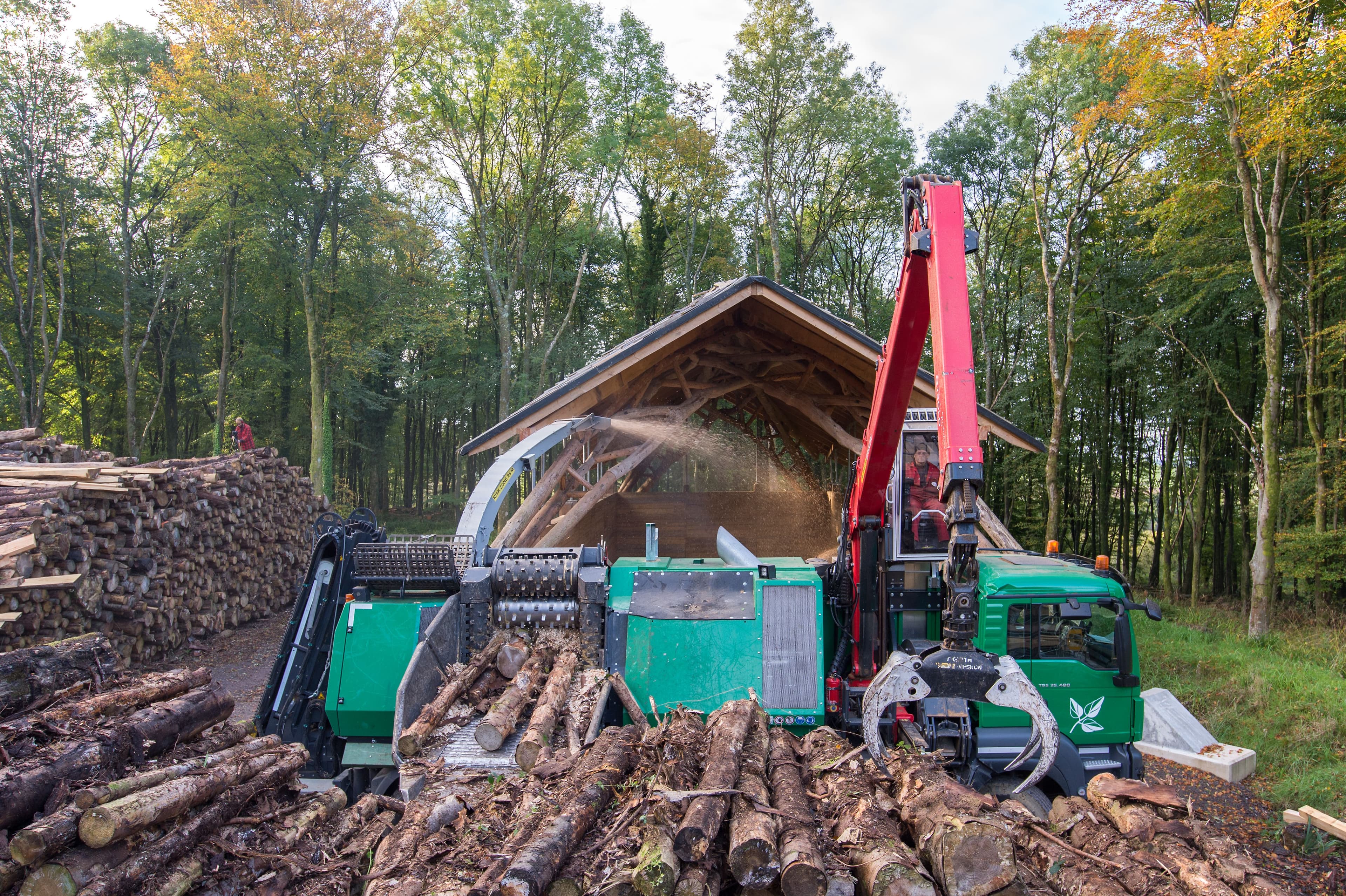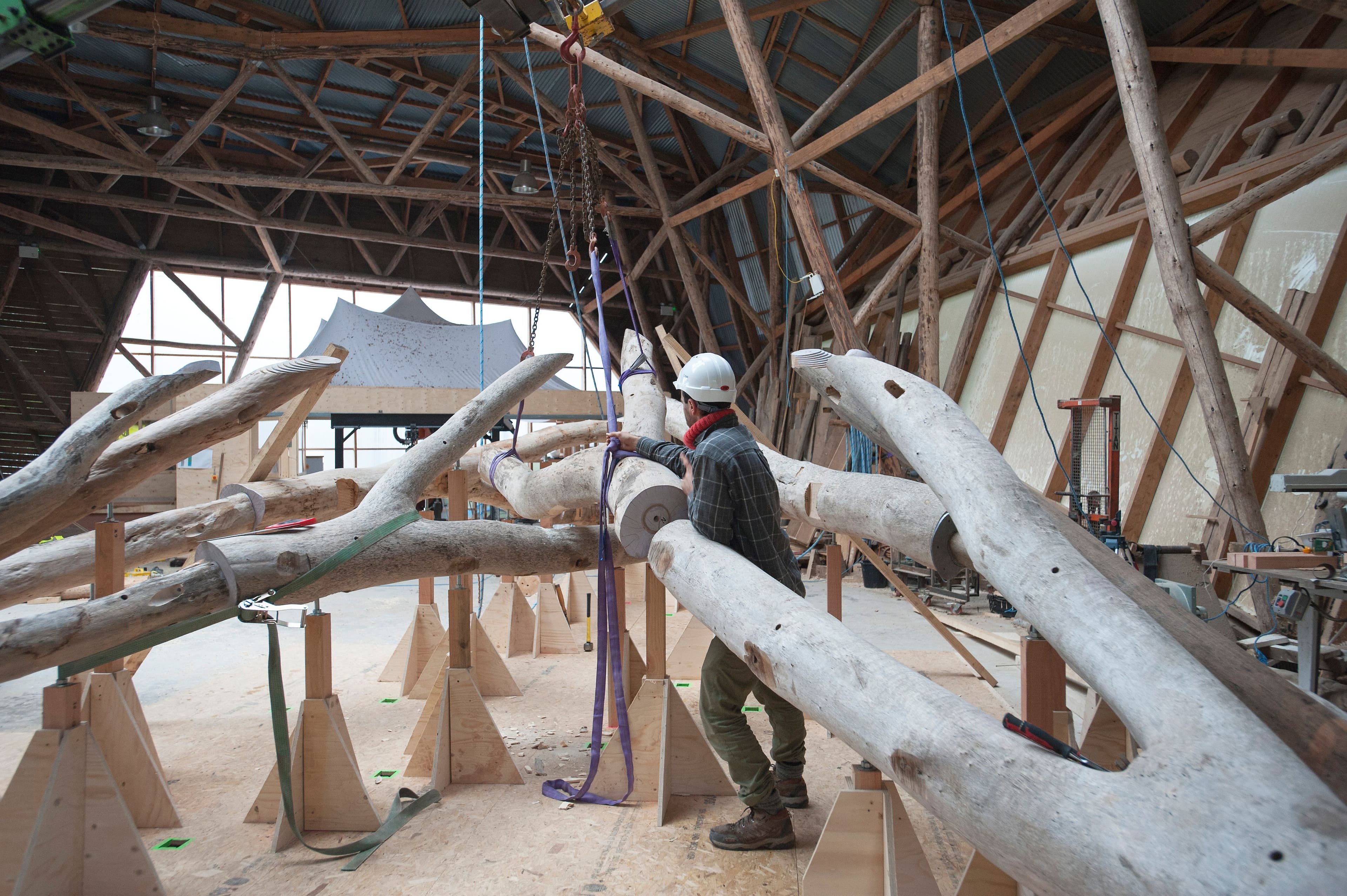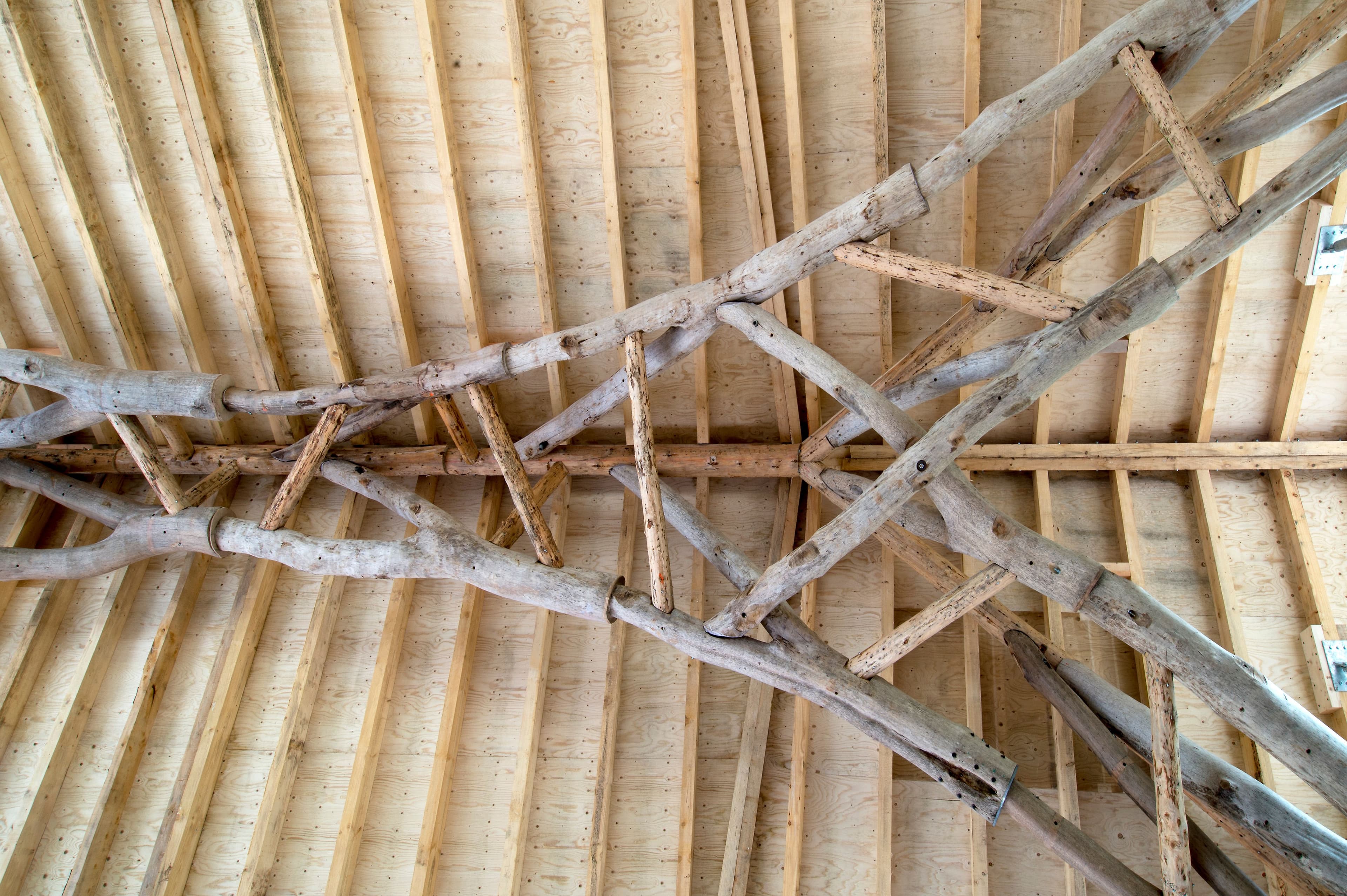 The Woodchip Barn structure provided storage for woodchip generated at Hooke Park to fuel the Biomass Boiler House. With a storage capacity of 400m3, it enabled the woodland to process and use its own timber for renewable heat production. The barn’s arching structure was formed from forked beech-tree components directly sourced from the surrounding woodland. The inherent form and structural capacity of the natural tree is transferred and exploited within the truss structure using 3D-scanning techniques and robotic milling to form the connections. Completed in 2016, the Barn reached the end of its lifespan in 2023 when its exposed timber footings degraded and the structure was safely demolished.